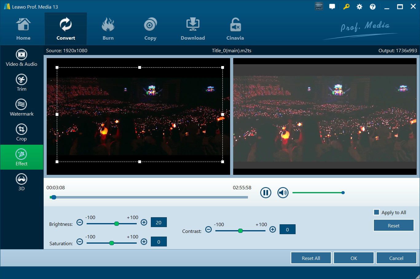 With the built-in DVD editor, Leawo DVD Ripper allows you to edit source media files by trimming, cropping, watermarking, adjusting video effects and applying 3D