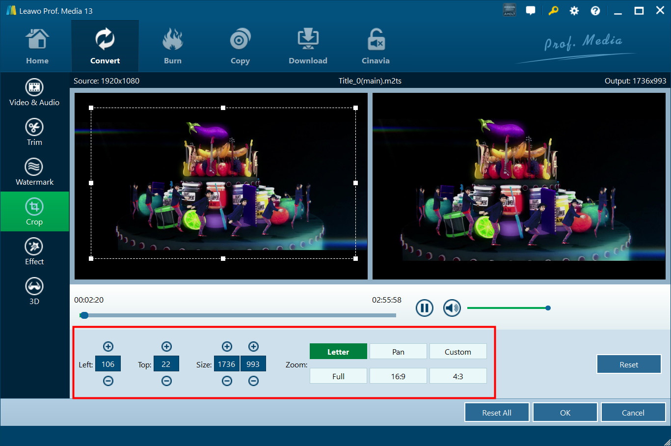 Under “Crop” button, directly drag the dot frame to crop video, or select Letter/Pan/Custom/Full/16:9/4:3 in "Zoom", and adjust values in "Left"/"Top"/"Size" to get your desired video size. Press "OK" to confirm it.