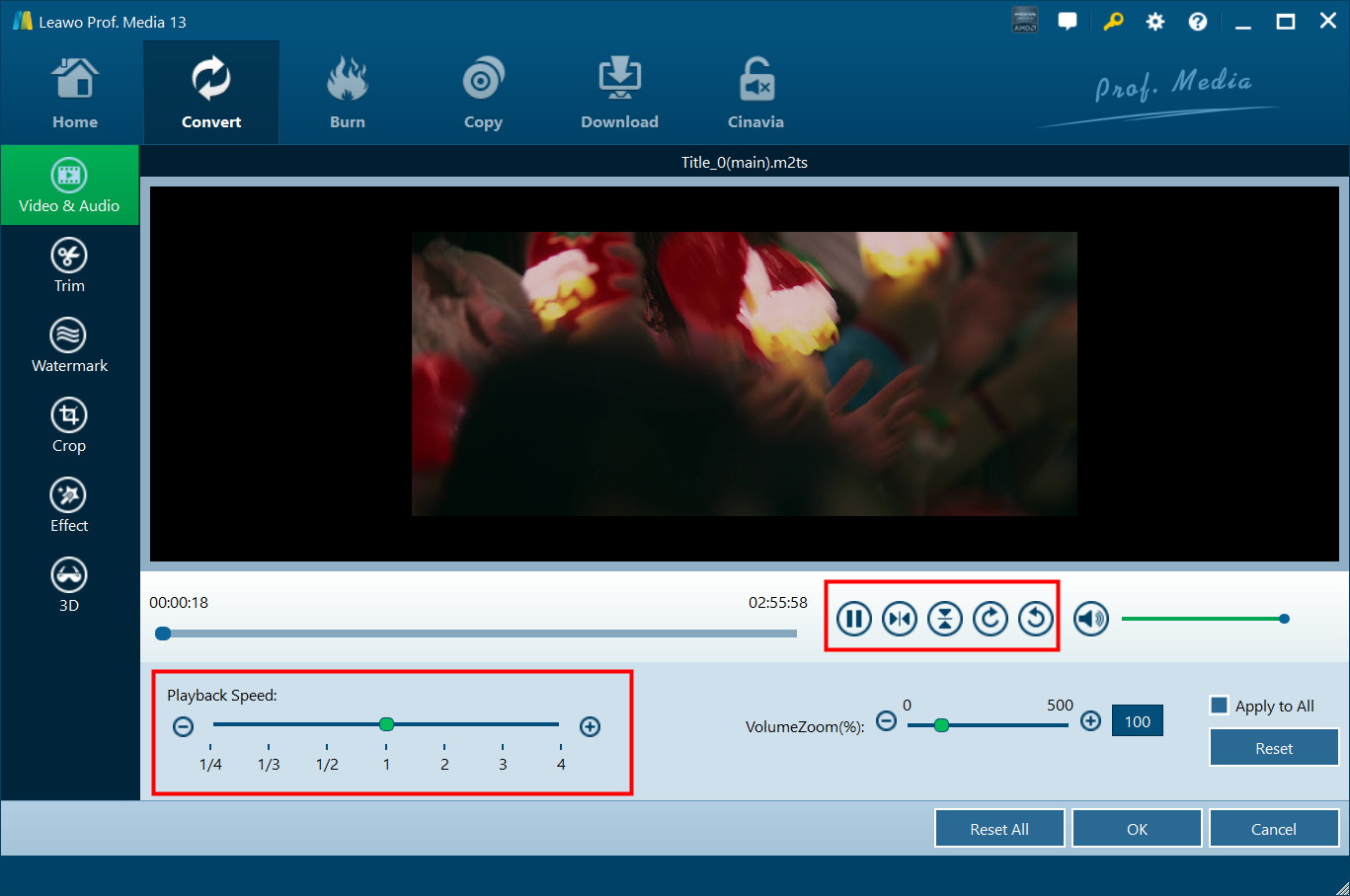 In Video & Audio section, you can adjust Playback Speed from 1/4x to 4X for output, check to Remove Noise, adjust video VolumeZoom, and rotate video in horizontal-flip, vertical-flip, 90-degree clockwise, or 90-degree counterclockwise. Reset it or click "OK" to confirm it.