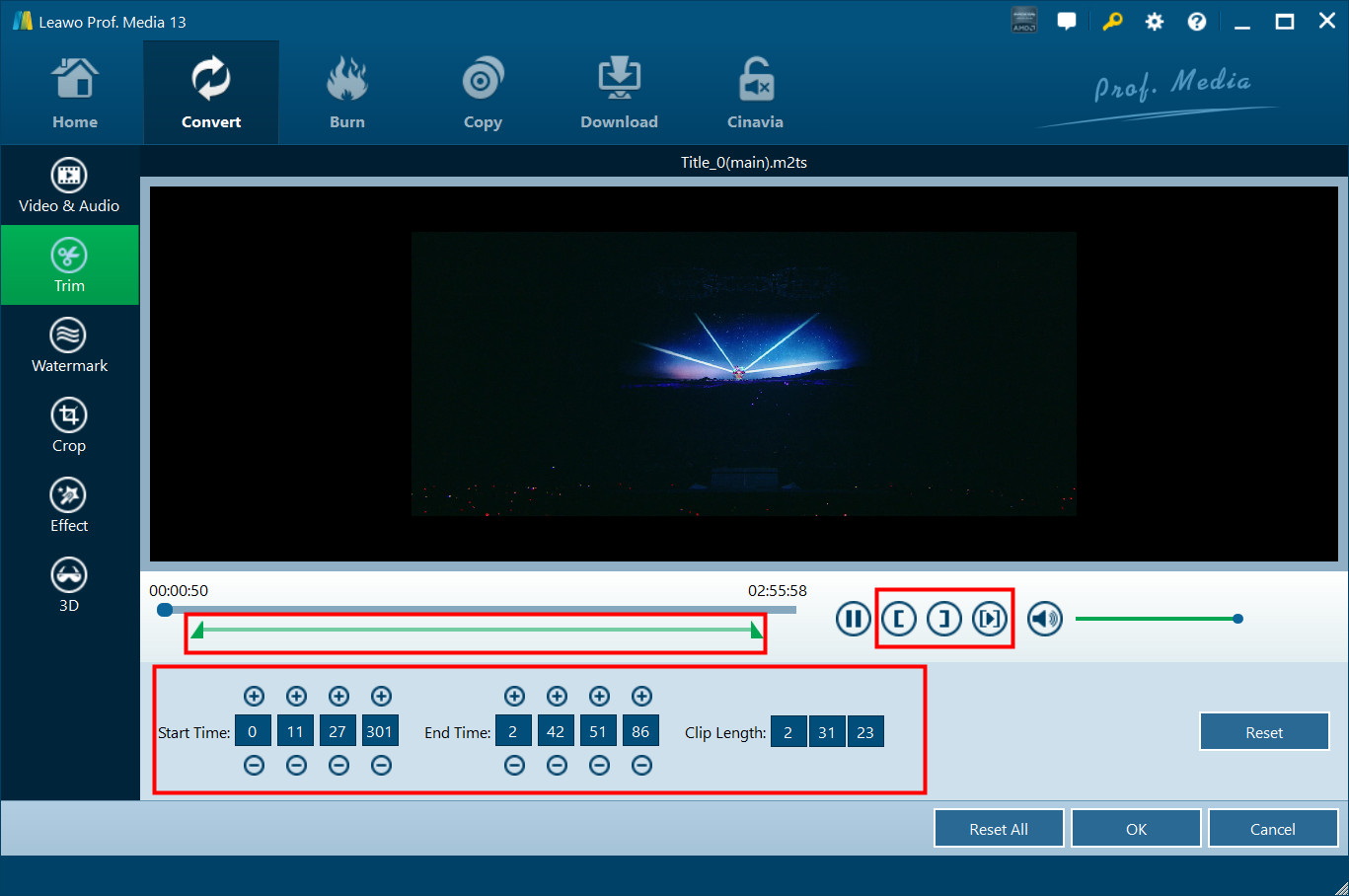 Under “Trim” section, you can directly drag the slide bar to trim video length, or manually input values in "Start Time" and "End Time" box. The clip length can be viewed instantly. Reset it or click "OK" to confirm it.