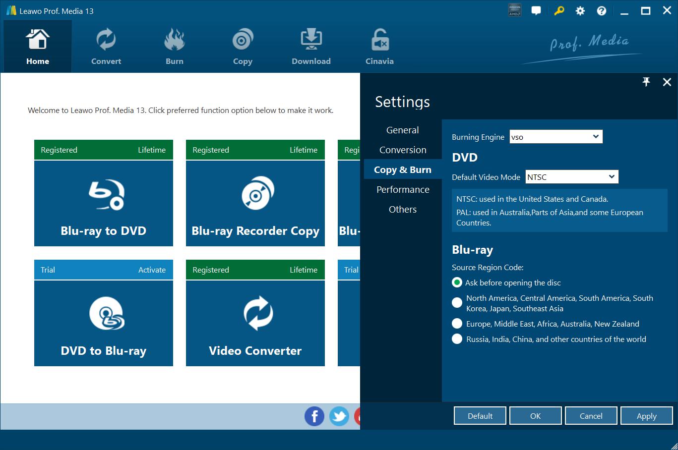 On "Copy & Burn" tab, set Burning Engine, default video mode for DVD, source Blu-ray region code, etc.