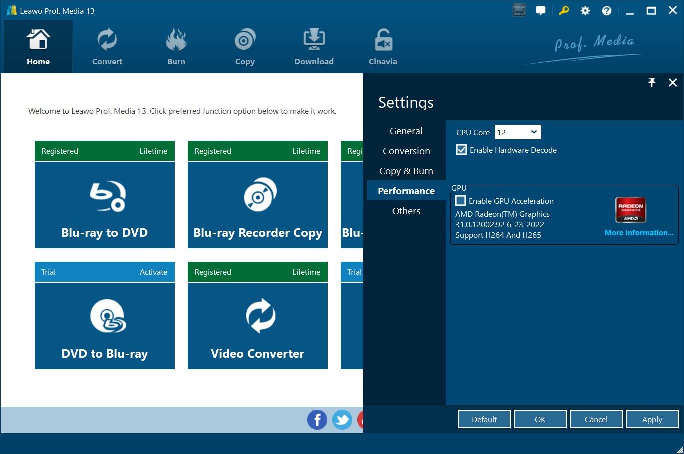 On "Performance" tab, set CPU core, choose to enable hardware decode, and choose GPU acceleration.