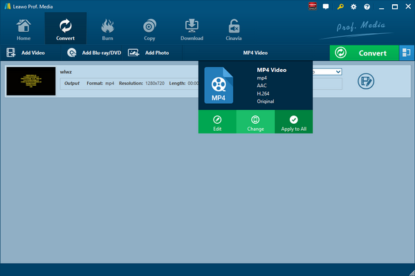 Launch Leawo Video Converter, go to the “Convert” tab, and click “Add Video” button on the sub-menu to load your source MOV video files. Alternatively, you can directly drag and drop MOV video files into the program interface. After MOV video files are imported, you could play back MOV video files, select subtitles and audio tracks from source MOV video files, add external subtitles to loaded MOV video files, edit loaded MOV video files, etc.