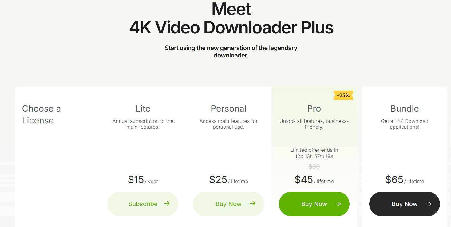 If you are a new user, you can get 4K Video Downloader Plus free trial with some limitations (daily download quantity limit and other limitations) or directly purchase 4K Video Downloader Plus Lite license at $15/year, Personal license at about $29 for lifetime use, Pro license at $45 for lifetime use, or the Bundle license at around $65 for lifetime use.