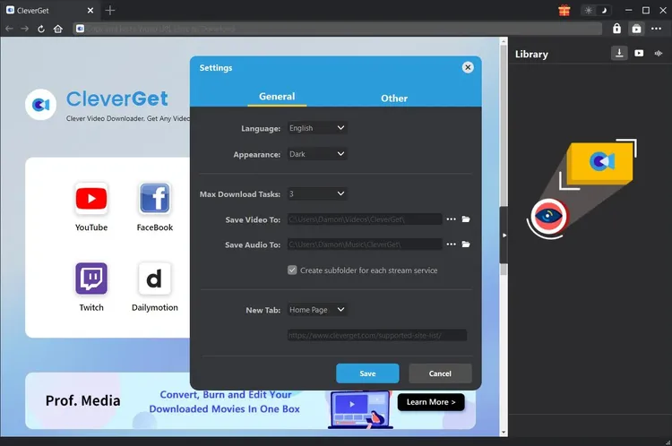 Now open Settings by clicking the three-dot icon. Next, go to the General tab. Now, here you can choose where you want your videos saved in the “Save Video To” box. Click Save to confirm.