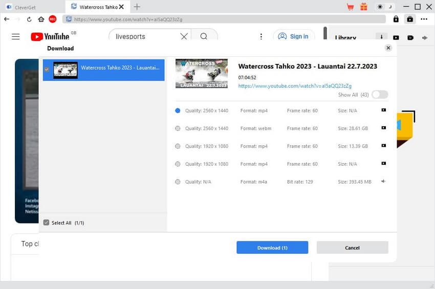 CleverGet Video Downloader will detect all available sources to download. All downloadable options will be listed on the download panel in seconds. Select one and click “Download” to start downloading. After a short while, you can watch the downloaded sports live stream offline.