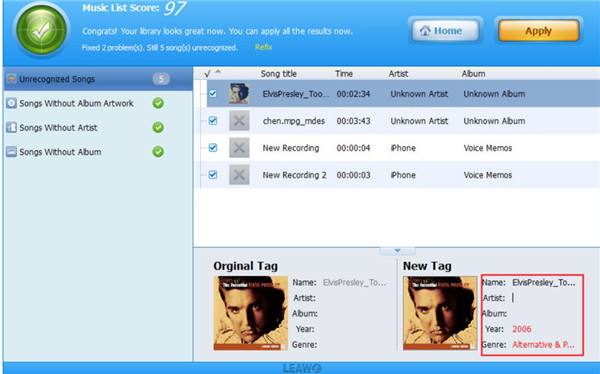 For the purpose of fixing music info, you can click on the edit icon in each music frame to change or add the music tags, such as artist, album, album cover and so on. After you finish the editing, you can hit “Apply” button at the top right corner of the window to reach your target.