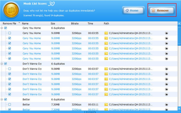 c) After the scanning is over and you will see a list of the duplicated songs. Click on “Remove” button after you tick the music that you want to delete from iTunes library. In a few seconds, you can realize your goal.