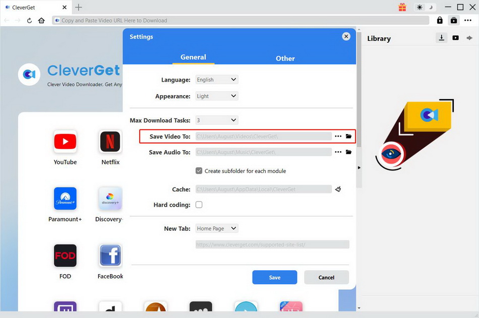 Before music video download, you can change the default output directory. Just click the three-dot icon at the top right and choose the "Settings" option. In the pop-up window, click the "Save Video To" box to browse and choose an output directory for your downloaded videos.