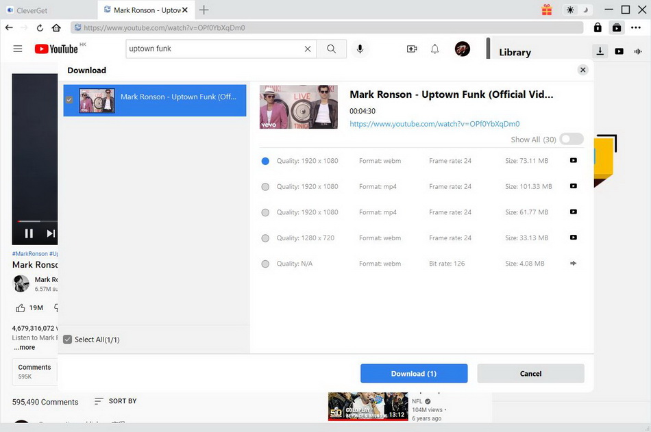 Once the video is played, the program will immediately start detection. In a few seconds, you can see a list of all available videos and audios pops up along with their detailed parameters. You can then choose the desired option according to your needs and click the blue "Download" button to start downloading music videos of best songs of the 2010s to your computer.