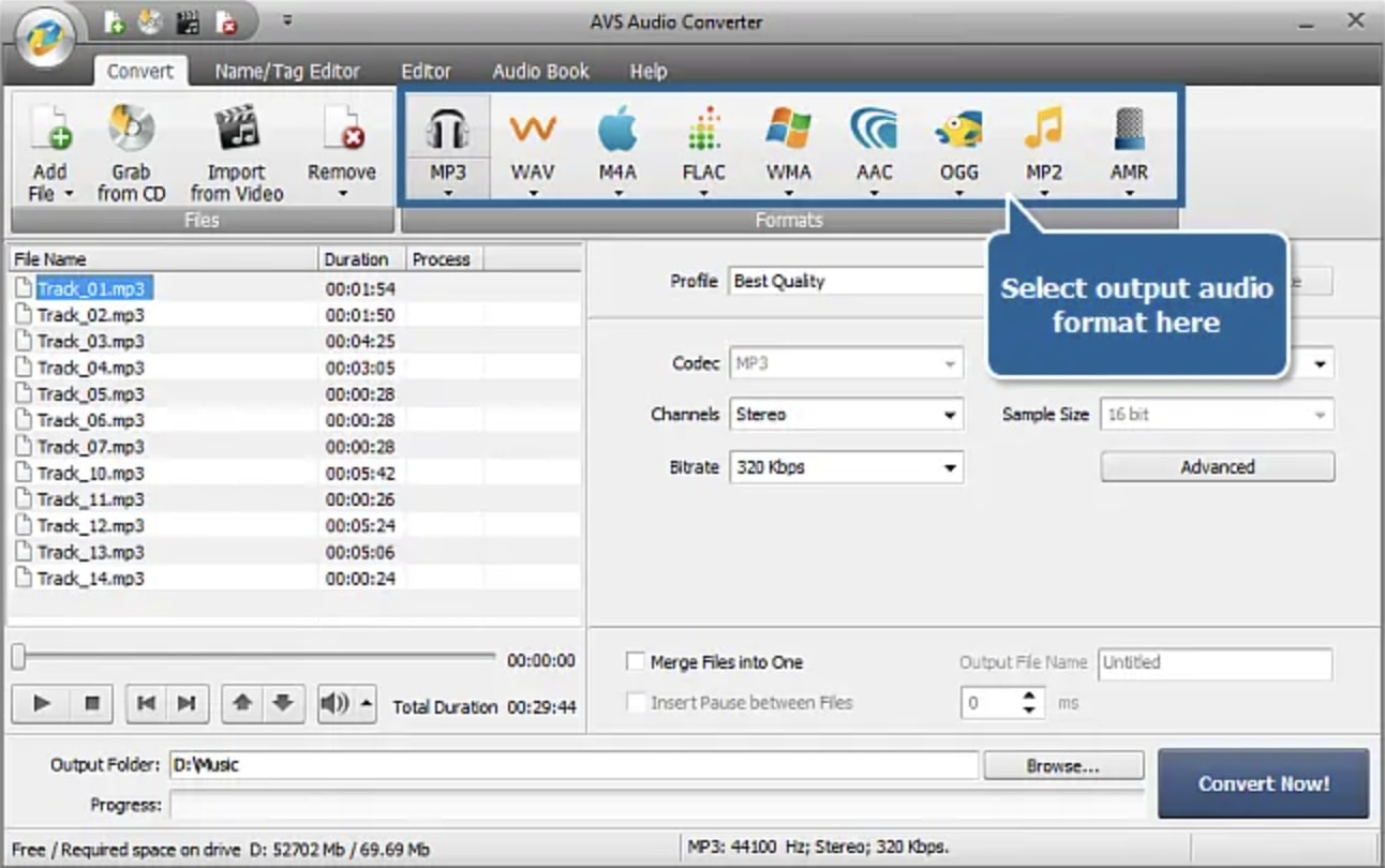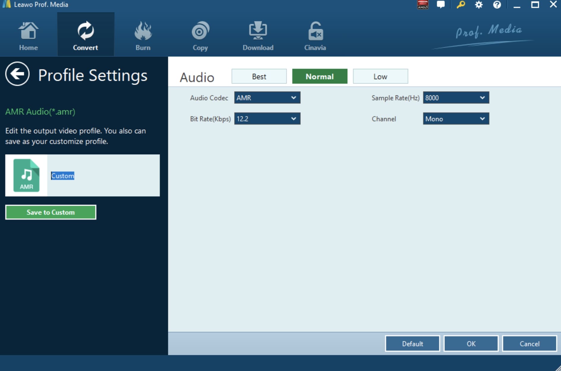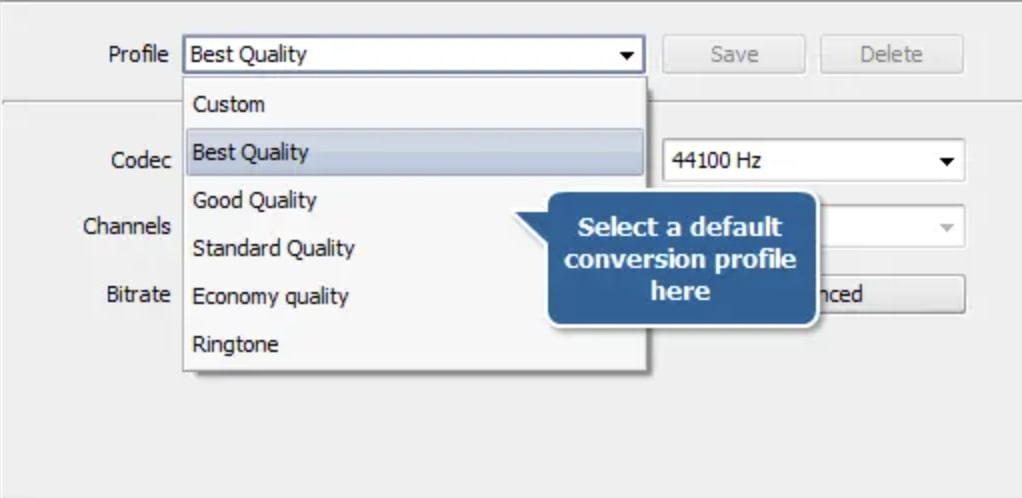 You can set output parameters in the drop-down list of the “Profile” field. You can use the default profile if you are new to audio conversion.