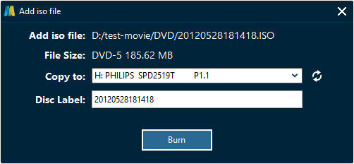 Click the inverted triangle drop-down arrow and then select “Add ISO file” to add the ISO file you created from the previous step. Set your disc burning options on the “Add ISO file” window and then click the “Burn” button, to start burning the generated ISO file to a new DVD or Blu-ray Disc.