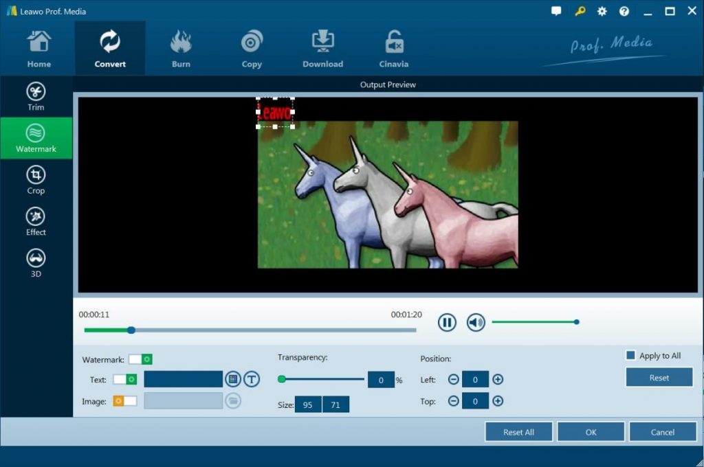Switch to "Watermark" section, the Watermark button will turn to green, then you can just add either Text or Image as video watermark. Watermark Transparency, Left Margin, Top Margin, Image Size are adjustable. Hit "Apply to all" to add watermark to all videos.