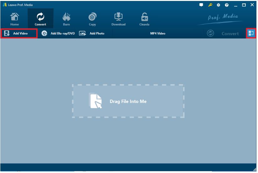 Run the module of video converter in the main interface of Leawo Prof. Media. After you enter the interface of video converter, you can see the blank area in the middle of the interface. You can drag the video source file and put it in the blank area or click the "Add video" button to add the video.