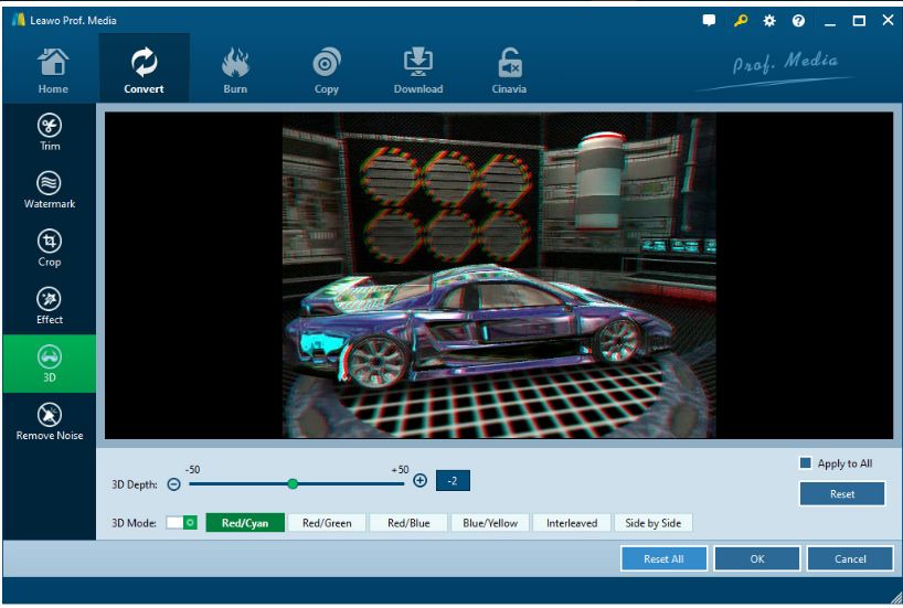 You can slightly customize the 3D effect by adjust the parameter setting in the "3D Depth". If you want to apply the 3D effect to all video files, just click the "Apply to all" button.