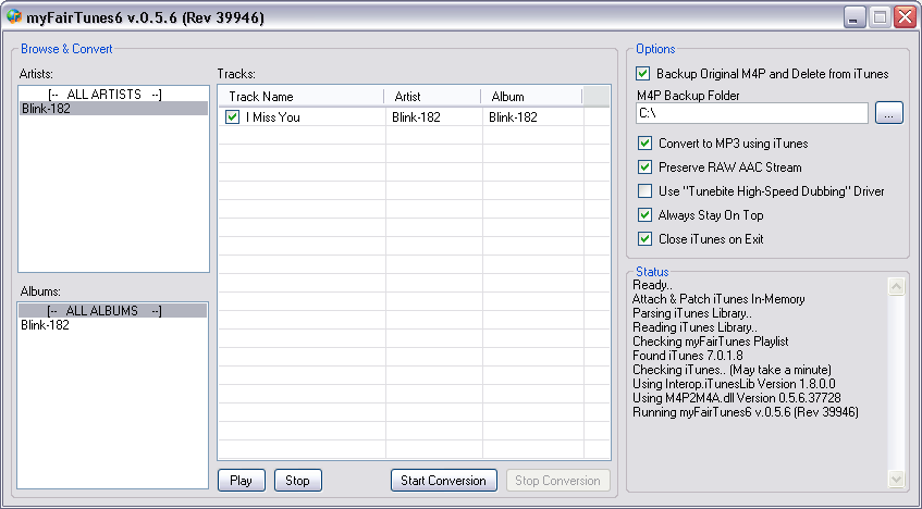 As a well-known iTunes DRM removal program, myFairTunes is able to unlock DRM from encrypted iTunes M4P audiobook. MyFairTunes is totally free of charge, and it is easy to use. It can convert DRM-protected M4P file to DRM-free MP3, and the conversion process is quality lossless, which means we can keep the original quality of iTunes M4P audiobook. However, myFairTunes is outdated, and if your iTunes is the latest version, you need to downgrade your current iTunes version to 7.5.0 or earlier, otherwise myFairTunes 7.0.2 will not work. Check out the guide below to convert iTunes M4P audiobook to MP3 with myFairTunes.
