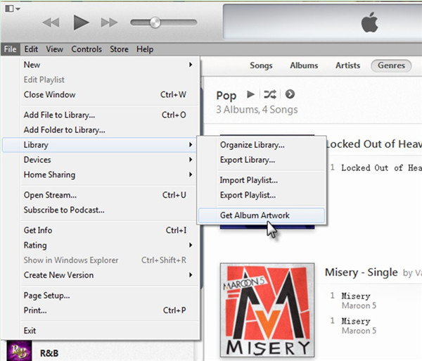 2. Click on “File” tab and then navigate to “Library” menu to choose the option of “Get Album Artwork”.
