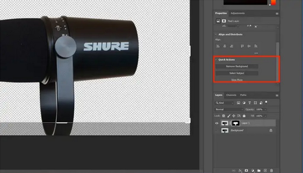 Step 4: Go to the Properties palette on the right side of the screen and then hit on the button of “Remove Background” from the section of Quick Actions. This step can assist you to handle how to make background transparent in Photoshop quickly.