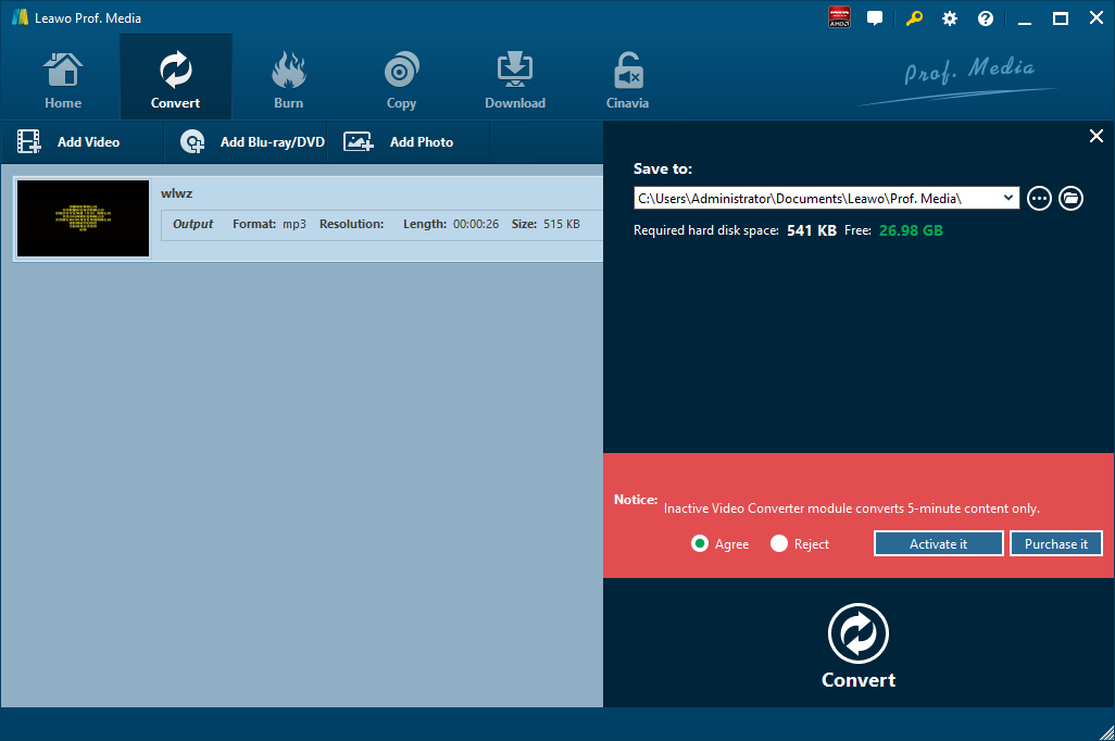 Launch Leawo Video Converter, go to the “Convert” tab, and click “Add Video” button on the sub-menu to load your source music files. Alternatively, you can directly drag and drop music files into the program interface.
