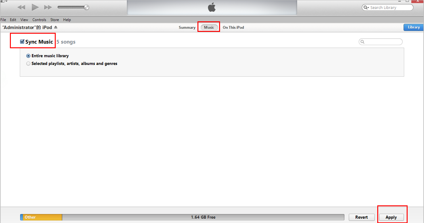 Connect iPod with your computer with a USB cable. Click the iPod button at the right top interface. Select “Music” > “Sync Music” > “Apply” to sync songs from iTunes to iPod. Please take note that you will lose any previous music files on your iPod when transferring music from computer to iPod with iTunes.