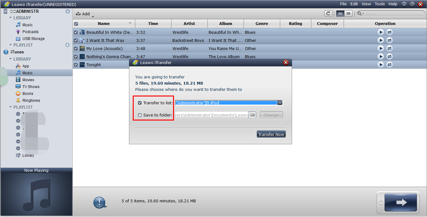 After you have picked up the demanded files, just click on the big Transfer button. In the pop-up window, you can see the destination name in “Transfer to list”. In “Save to folder” choose a folder on your PC for local PC backup. Confirm “Transfer now” to transfer files. This will enable the program to copy all the selected songs from Android to the iPod.
