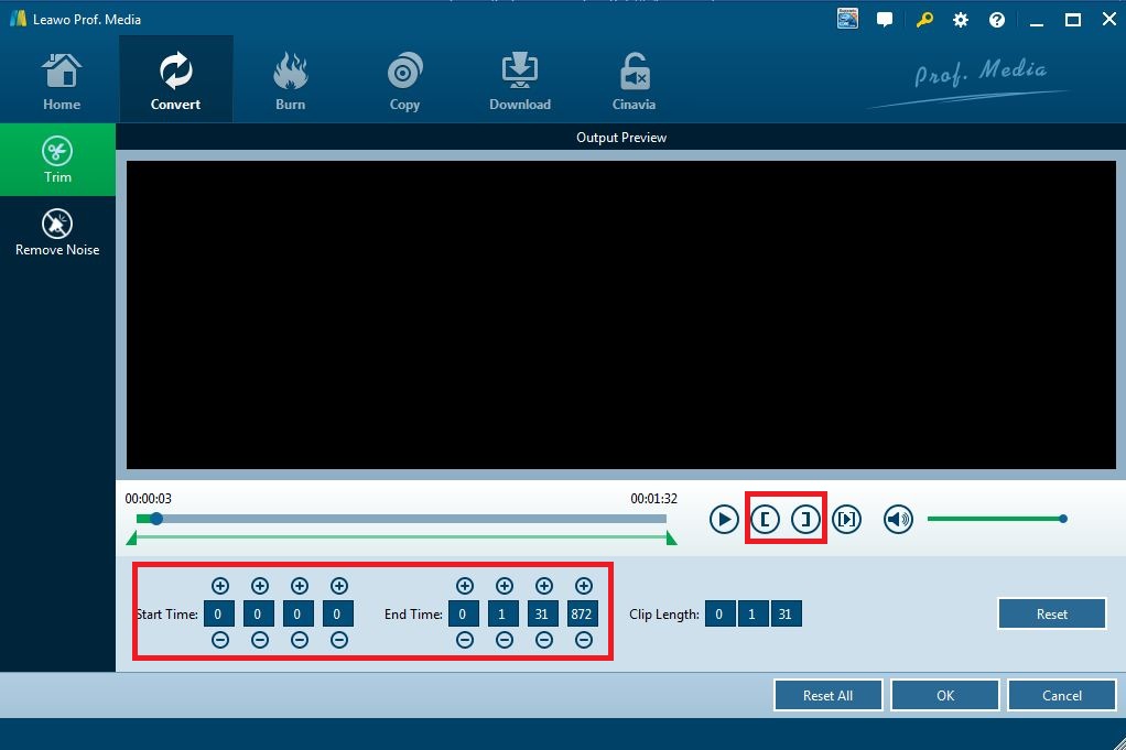 - 1. Move the green markers in triangle below the progress bar to trim the audio clip. The green marker in the left hand can be used to locate to the starting point of the trimmed clip and the one in the right hand is used to set the ending point. You can reset the trimmed clip by clicking the "reset" button or clicking the button in the shape of square brackets.