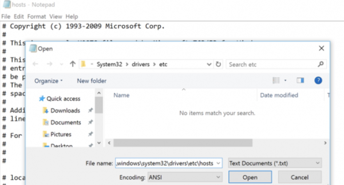 • - Open the following file: c:\Windows\System32\Drivers\etc\hosts. Click on the "hosts" and open it as " note" then confirm.