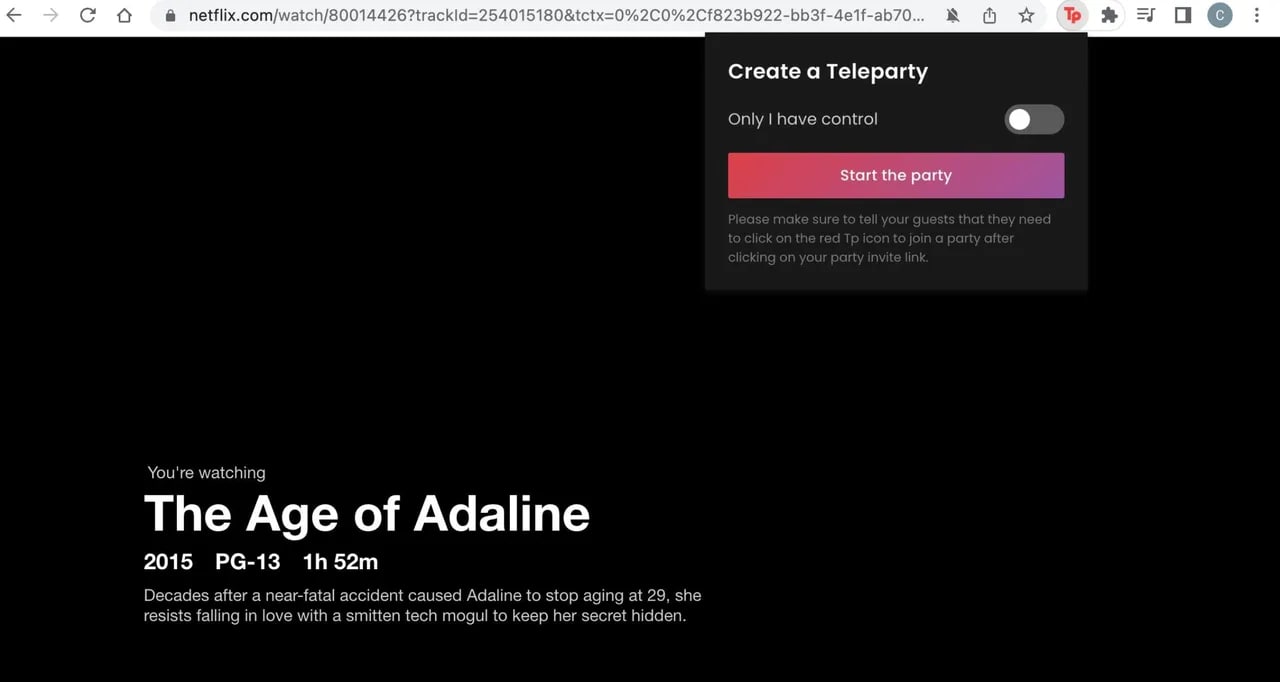 Step 3. Go to a streaming site to find the video you want to watch with your friends. Click on the TP icon in the upper right and click on the Start the Party button.
