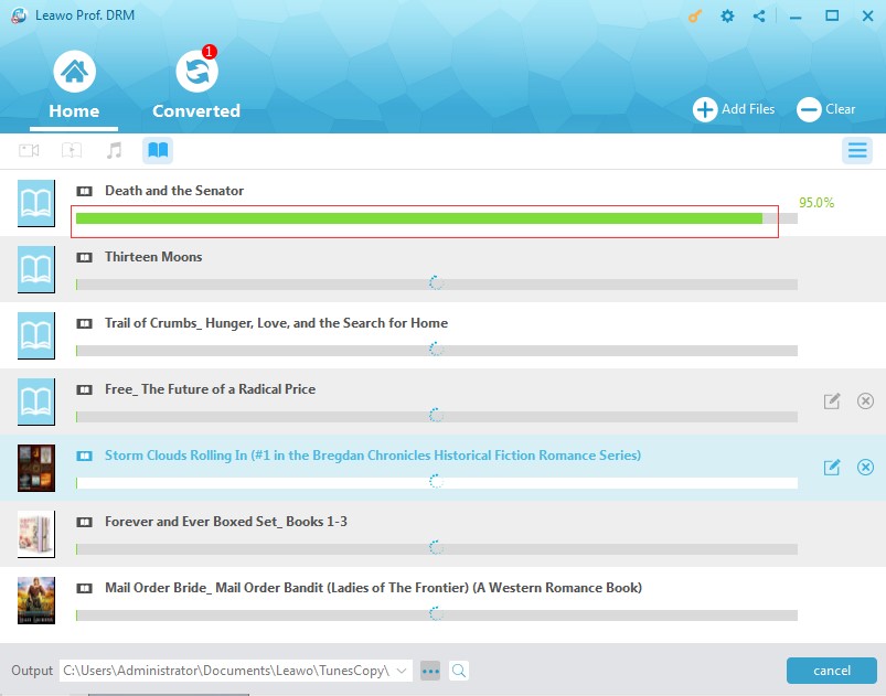 Click the “Convert” button in the bottom right corner to start conversion. The converted eBooks with DRM removal will be in the designated folders soon.