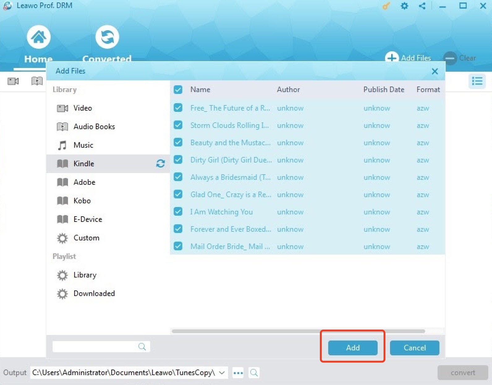 If you click “Add files”, you’ll see a popup window with the “Kindle” option on the left sidebar. Choose the eBooks you want to remove DRM and click the “Add” button.