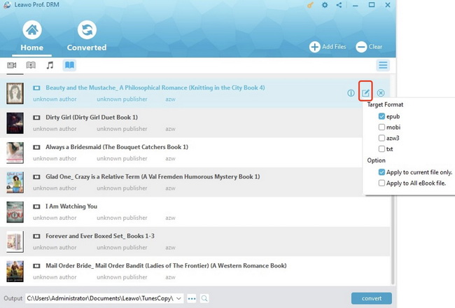 Click the pencil icon on the right side of loaded Kindle books, this is where you can set the output format. Please mind that iBook supports ePub and PDF format. You can edit it one by one or check the "Apply to all eBook Files" button to edit all.