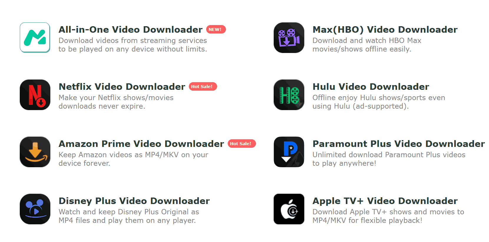 Support for Many Streaming Services: MovPilot has an all-in-one downloading software and also has many separate downloading programs, like MovPilot Netflix Video Downloader. It supported major streaming sites, including Netflix, Amazon Prime, Disney+, HBO Max, Hulu, Paramount Plus, Apple TV+, and social media sites like YouTube, Facebook, Twitter, and TikTok.