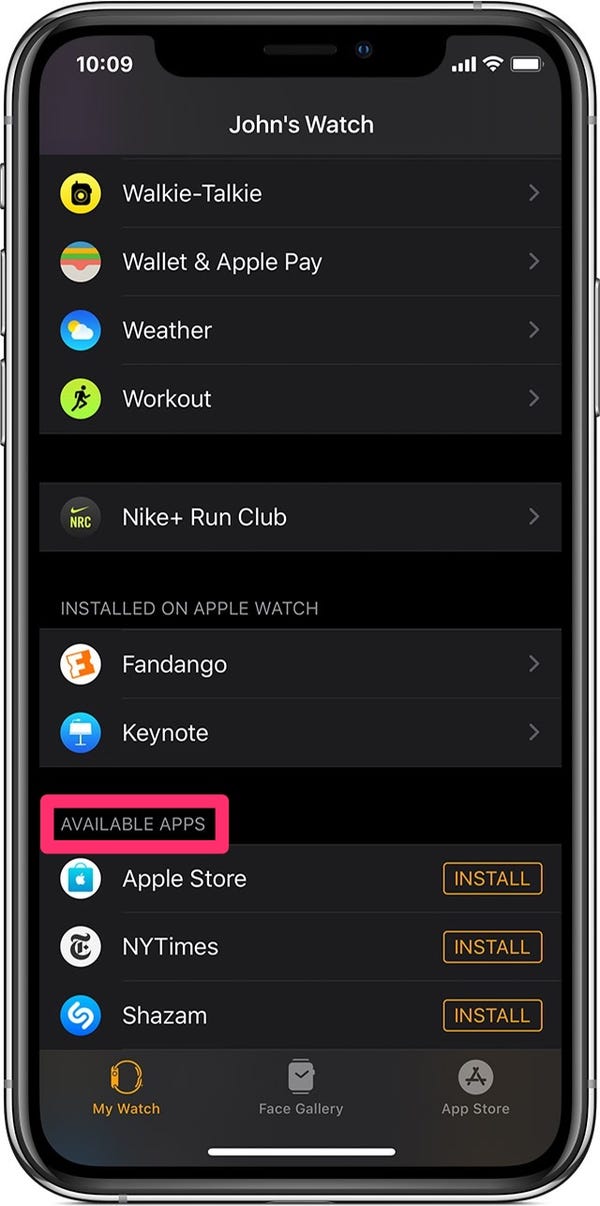 Once your Apple Watch is up to date with the full support of the independent Pandora app, you can download Pandora either on the paired iPhone or Apple Watch directly. For users who opt to operate on iPhones, you can access the Apple Watch app and navigate through the menu of the main page. Look for a section named "Available Apps" and keep moving down to locate the Pandora app. Tap the "INSTALL" button to let Apple Watch process and acquire it.