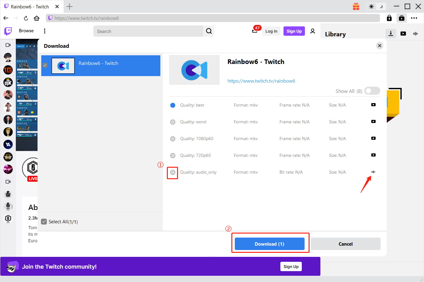 Choose a preferred quality and format. Find the options with the audio icon and click on the "Download" button to download Twitch streaming music.