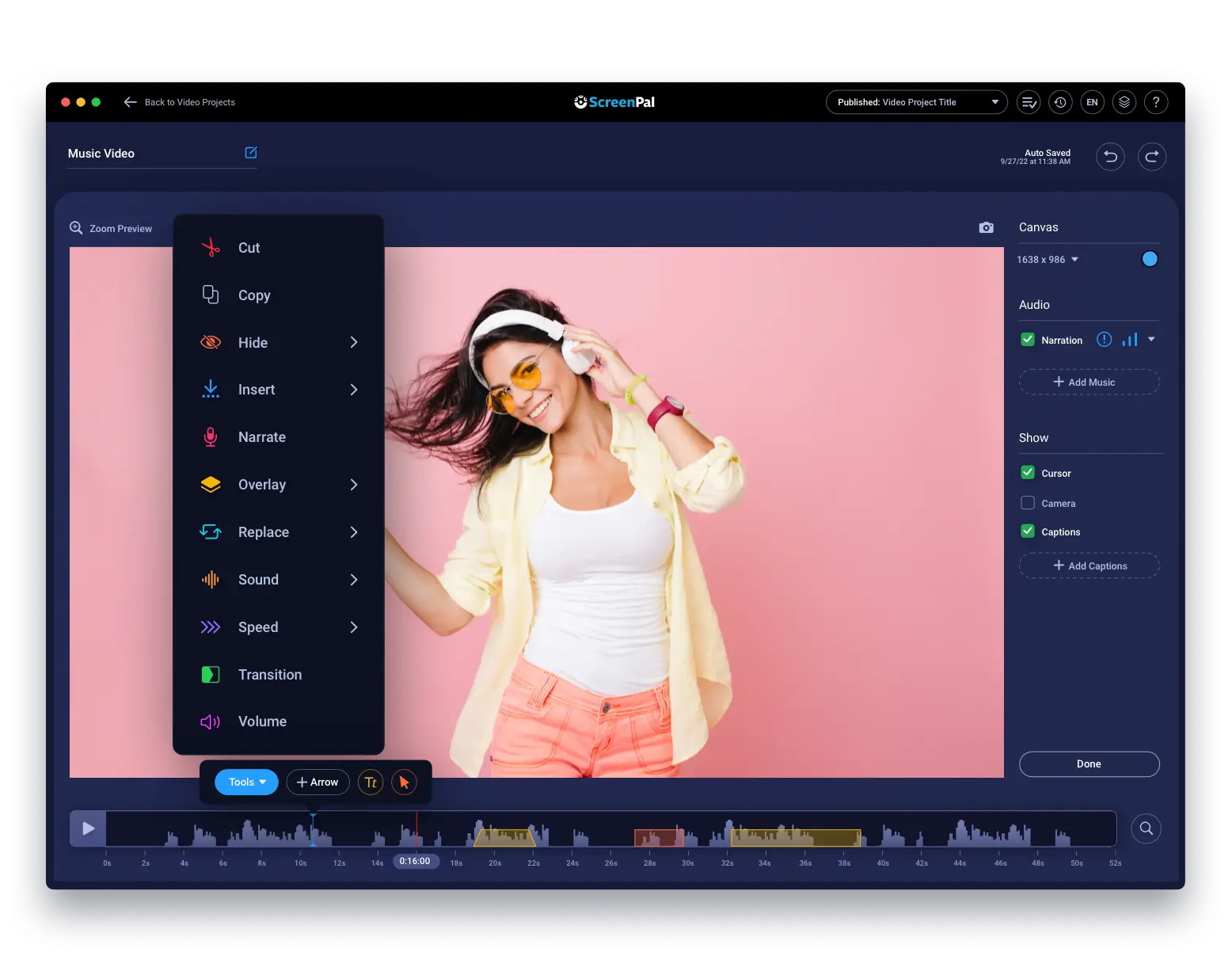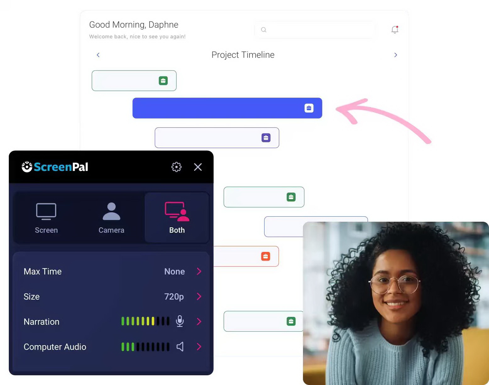 Want a picture-in-picture effect? ScreenPal can record you with your camera while recording the screen, so that the audience can see both your presentation and your face. This little detail can increase trust and attraction, especially when teaching or displaying products.