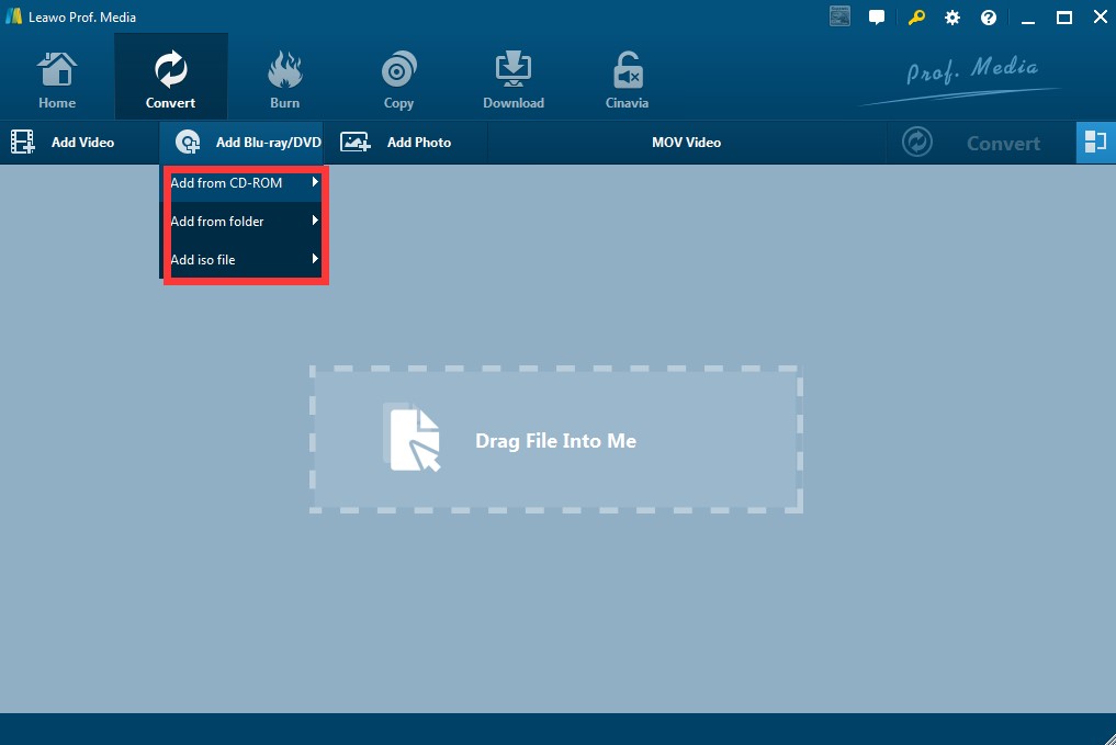 Step 2: Click “Add Blu-ray/DVD” on the second line of the menu, then you can choose from these three options: “Add from CD-ROM”, “Add from folder” and “Add iso file”, to add your file into Leawo DVD Ripper.