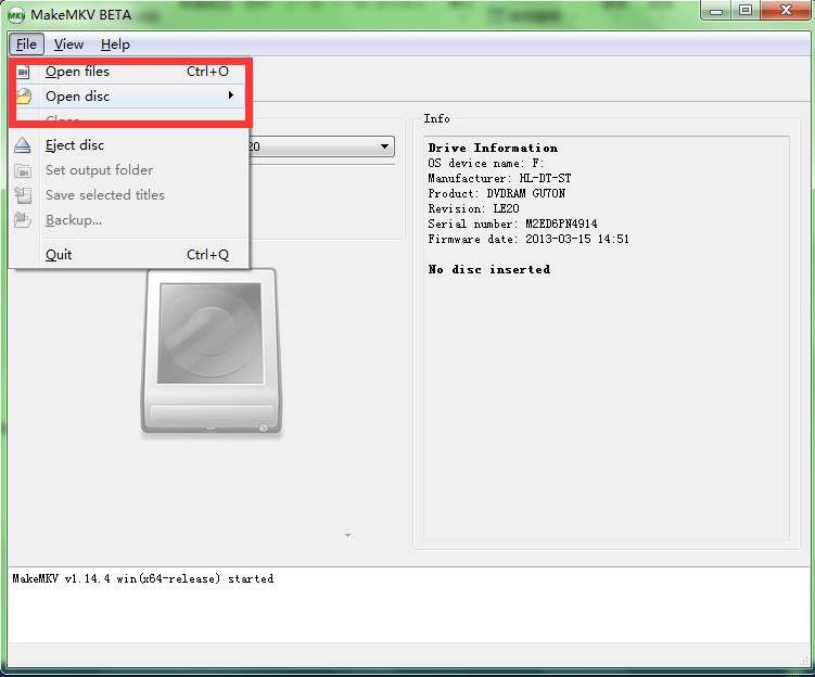 Step 2: There are 2 ways to import the file you want to rip in MakeMKV. One way is clicking the “Open files” to import Blu-ray/DVD files, another is clicking the “Open disc” button. Here I click the “Open files”.