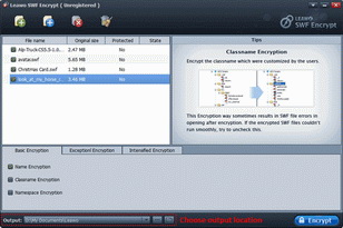 This SWF encryption software provides quite easy-to-use interface and SWF encryption operation. With only a few clicks, you can successfully encrypt your SWF files and protect SWF from unauthorized usages.