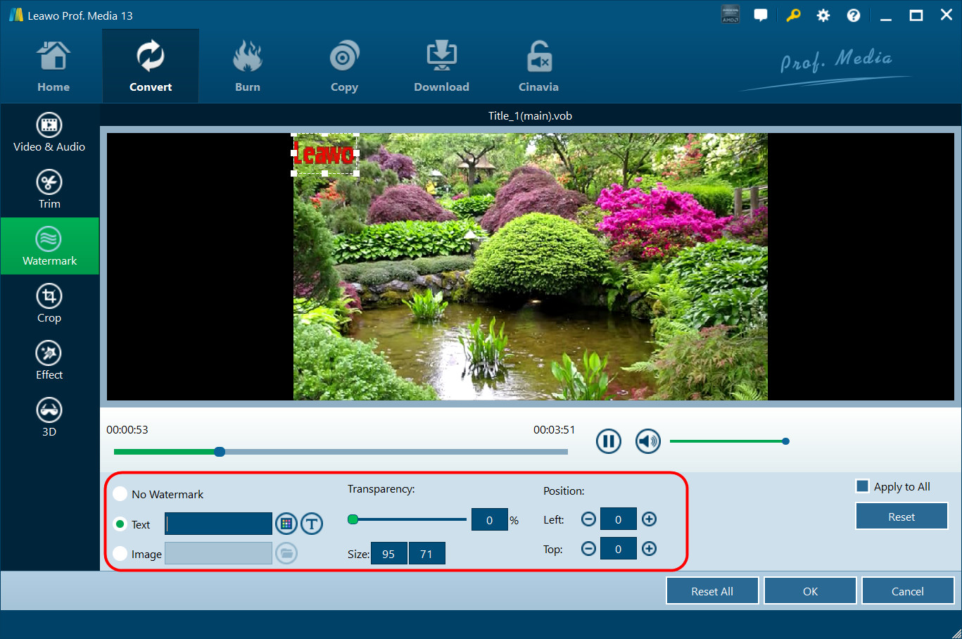 Sous l'onglet « Filigrane », faites glisser l'option « Filigrane » vers le vert, puis choisissez d'ajouter un filigrane de texte ou d’image. Vous pouvez définir la transparence, la taille, la position, la couleur, la police, etc. du filigrane. Vous pouvez même appliquer ce filigrane à tous.