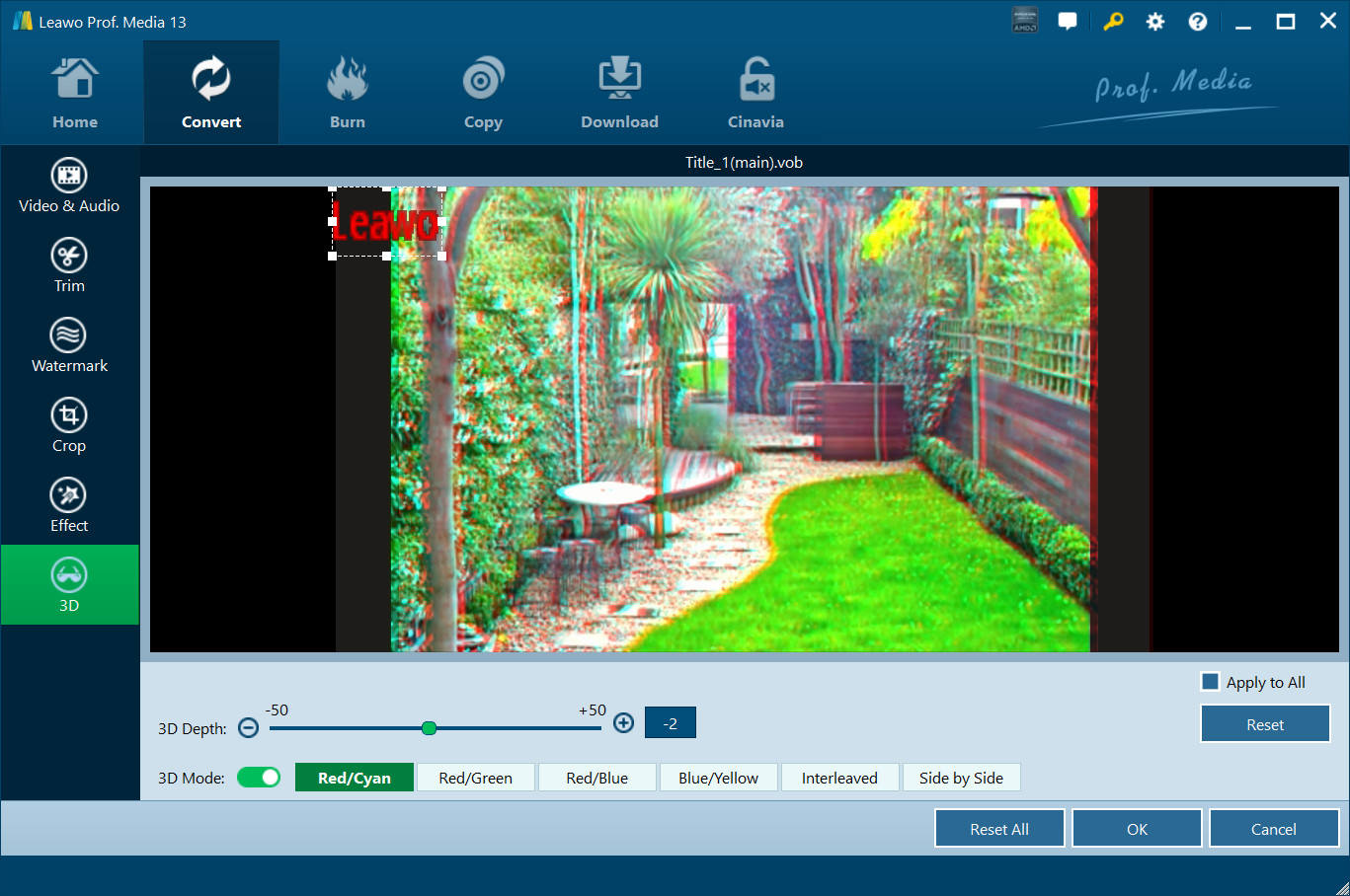 Sous l'onglet « 3D », vous pouvez appliquer l'effet 3D pour convertir un fichier BDAV 2D en 3D MP4/MKV/FLV/WMV/.... Vous devez d'abord faire glisser l'option « Mode 3D » vers le vert et ensuite choisir l'effet de film 3D. Vous pouvez choisir parmi 6 effets de film 3D différents : Rouge/Cyan, Rouge/Vert, Rouge/Bleu, Bleu/Jaune, Entrelacé, Côte à Côte. La profondeur 3D peut également être ajustée. Vous pouvez obtenir un aperçu instantané ici.
