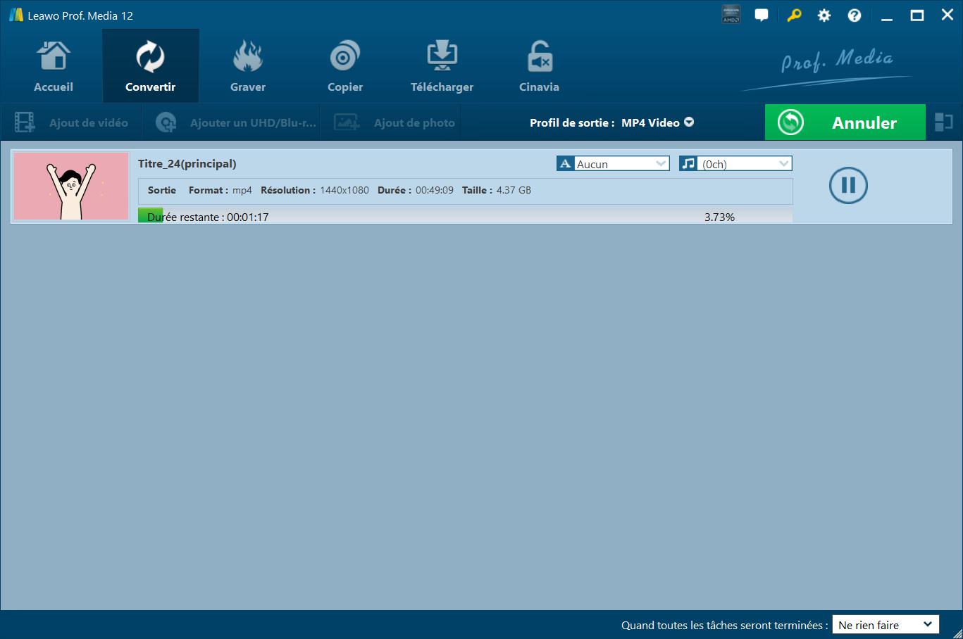 Enfin, cliquez sur le bouton « Convertir » en bas de la barre latérale pour lancer l'extraction et la conversion des fichiers BDAV en MP4, MK, FLV, WMV, AVI ou d'autres fichiers vidéo/audio. Ensuite, vous verrez le panneau de conversion, qui vous présente la progression détaillée de la conversion. Vous pouvez annuler/arrêter la conversion des fichiers BDAV à tout moment, et définir l'opération ultérieure dans le coin en bas à droite.