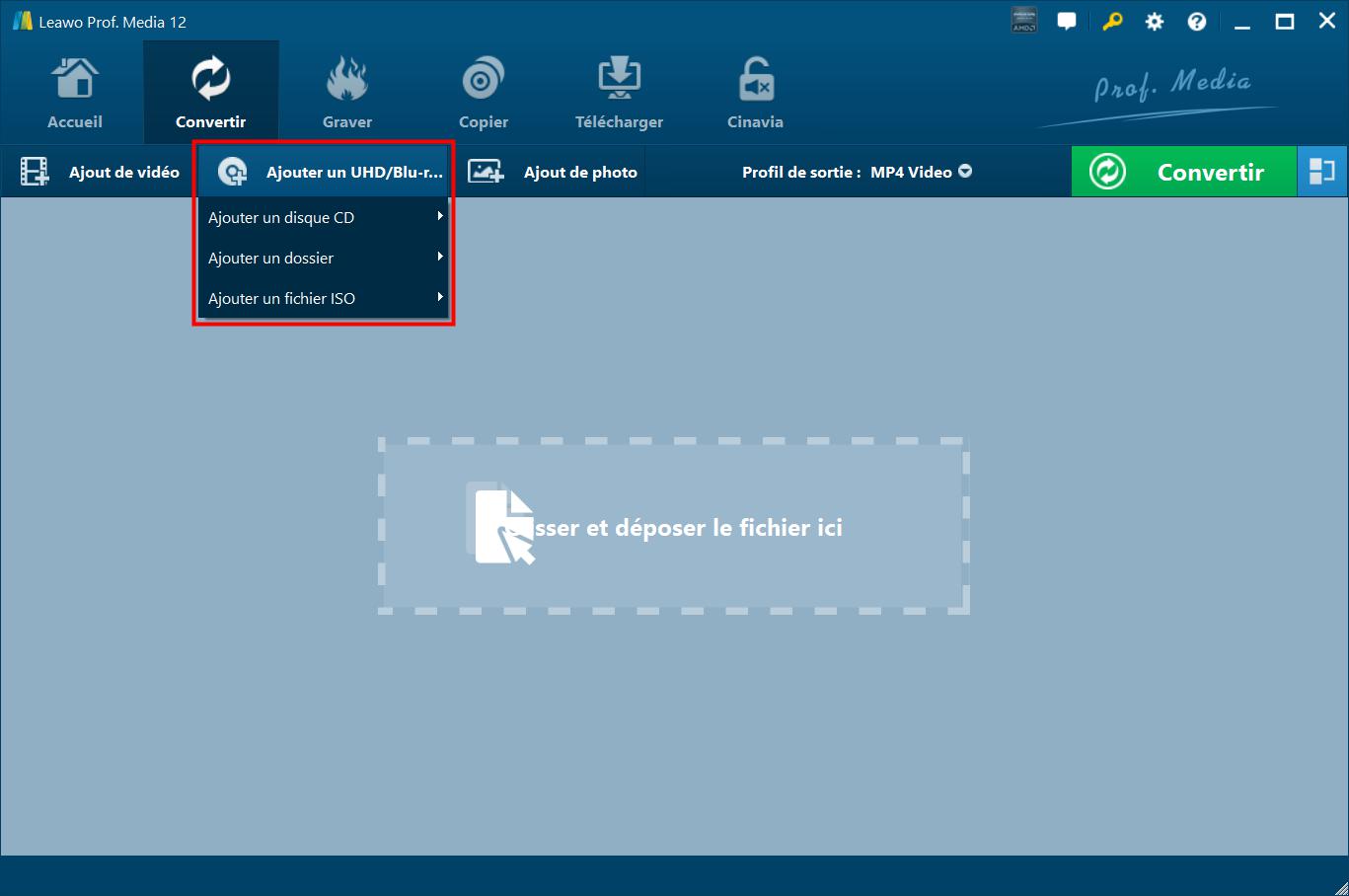 Sous l'onglet « Convertir », cliquez sur le bouton déroulant « Ajouter UHD/Blu-ray/DVD », puis cliquez sur l'option « Ajouter depuis un CD-ROM », « Ajouter depuis un dossier » ou « Ajouter un fichier ISO » selon vos besoins.