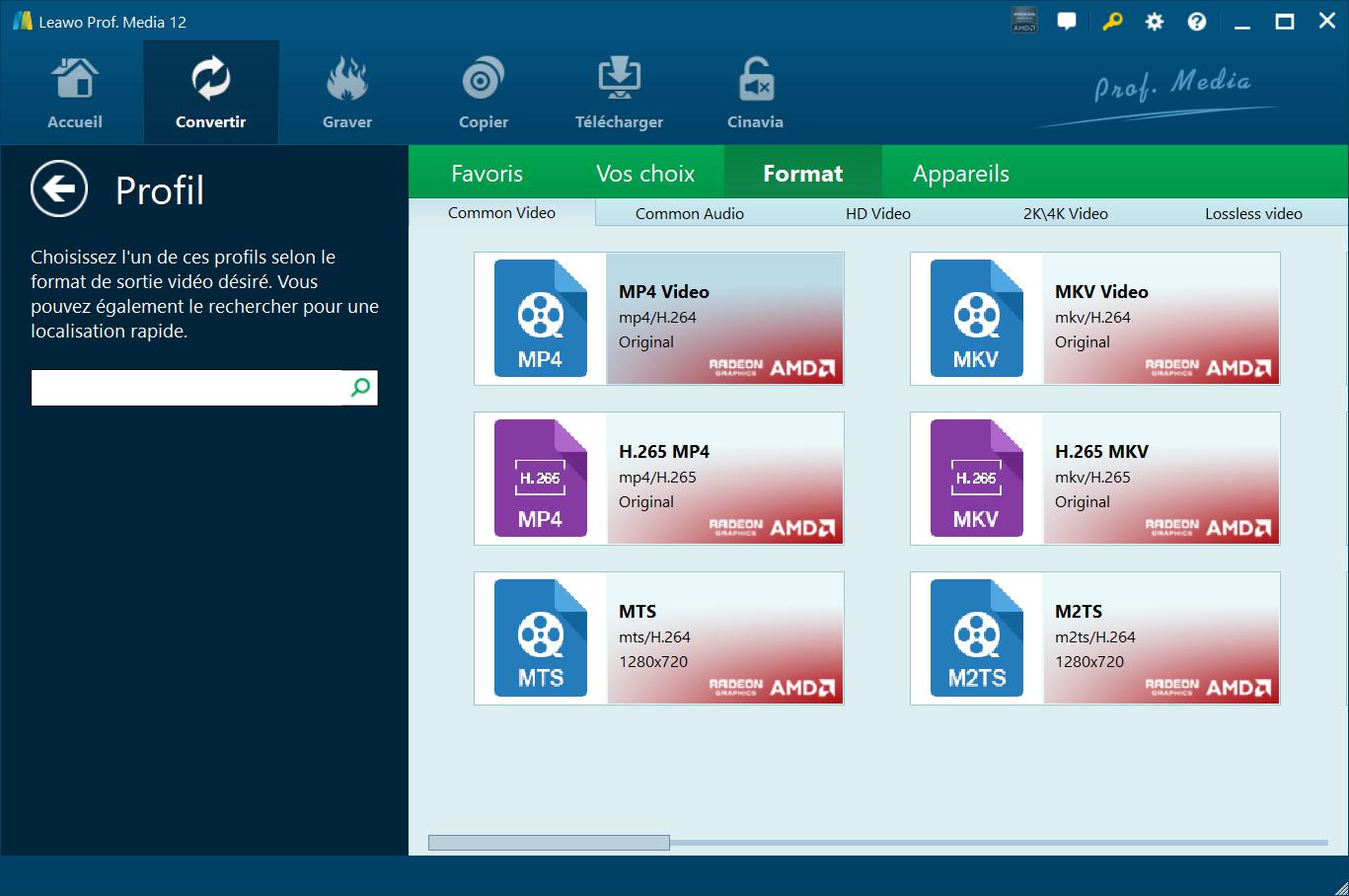 Sur le panneau « Profil », vous pouvez définir le format de sortie à partir de l'onglet « Format » ou « Périphérique », et ajouter un profil de sortie à l'onglet « Favoris », et ajouter un profil personnalisé à l'onglet « Personnalisé ».