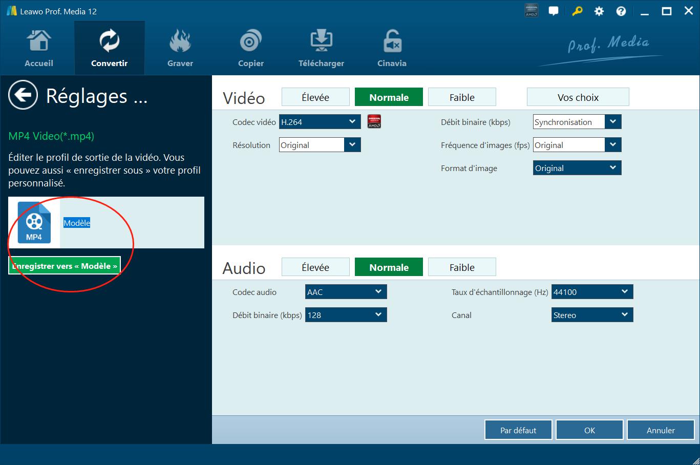 Comme mentionné ci-dessus, vous pouvez modifier les paramètres vidéo et audio de sortie dans le panneau « Paramètres du profil », y compris le codec vidéo, le débit binaire, la résolution, la fréquence d'images, le rapport hauteur/largeur, le codec audio, le débit binaire audio, la fréquence d'échantillonnage et le canal. Vous pouvez même enregistrer le profil personnalisé dans l'onglet « Personnalisé » pour une utilisation ultérieure.
