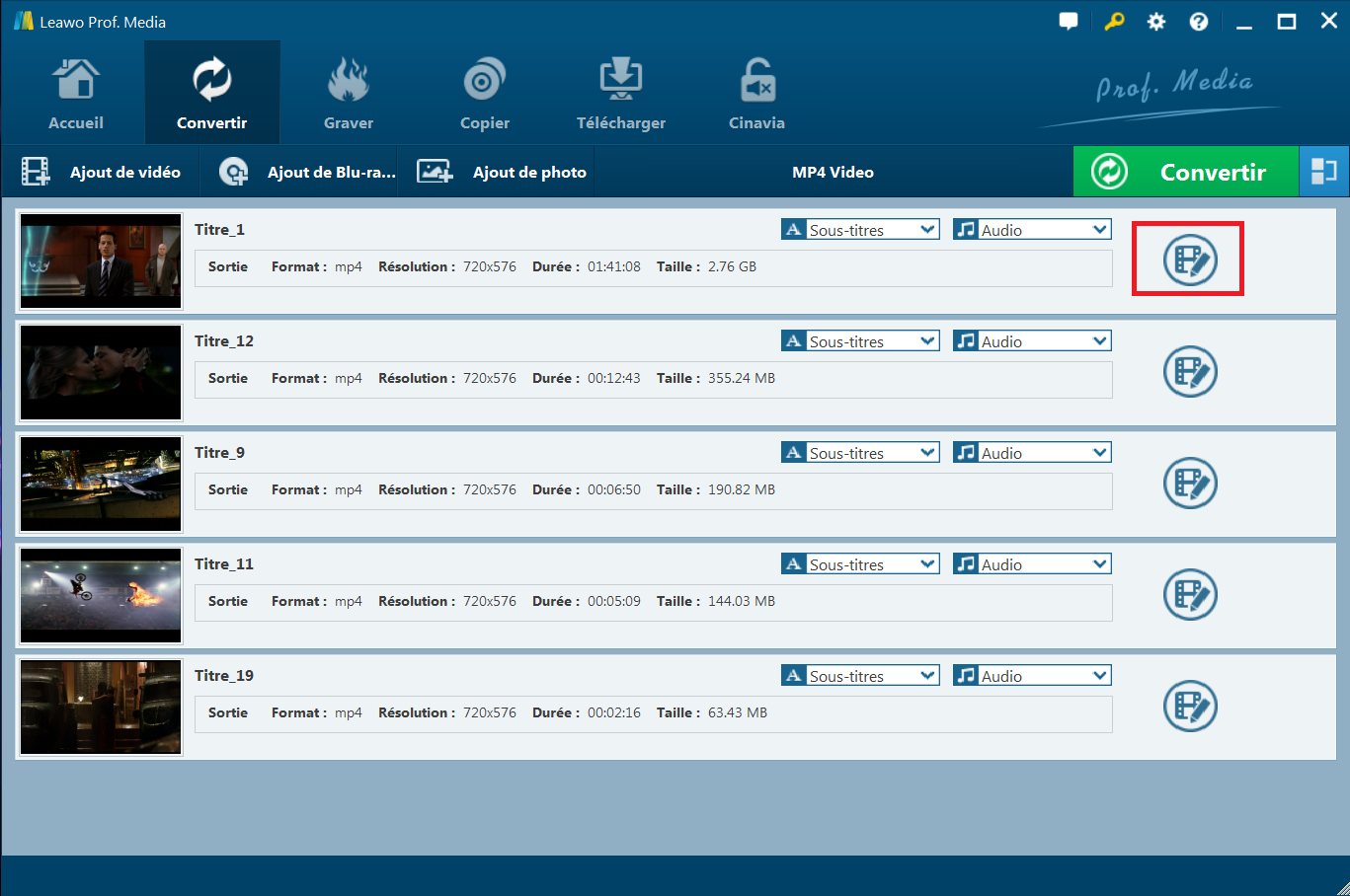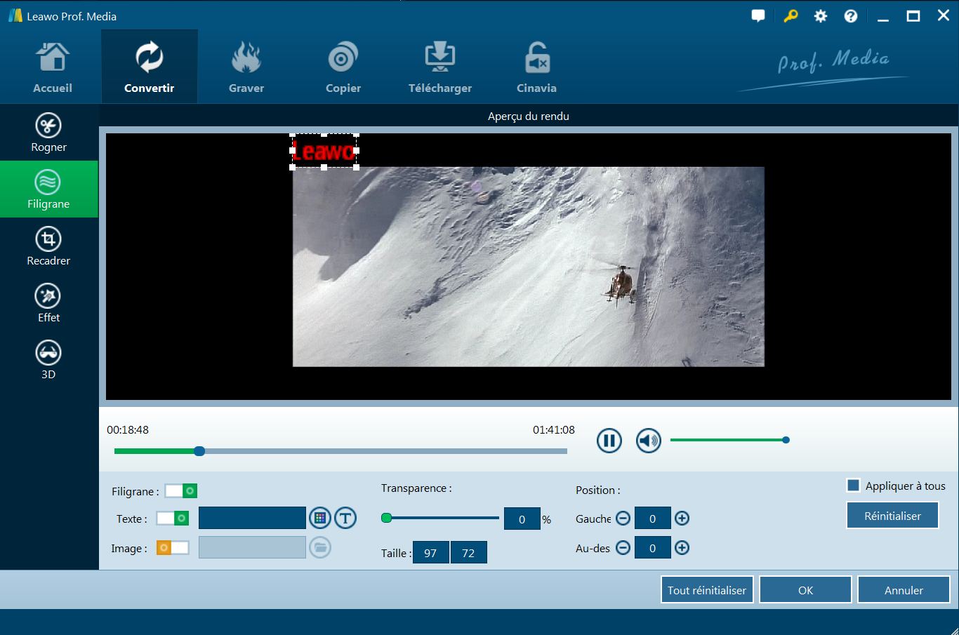 Avec un éditeur intégré de vidéo, Extracteur de Blu-ray de Leawo vous permet d’éditer la source des fichiers multimédias par les rogner, recadrer, ajouter un filigrane, régler l’effet vidéo et appliquer l’effet 3D. Dans le but d’ajouter la source des fichiers multimédias, vous pouvez faire un clic droit sur le fichier multimédia téléchargé et sélectionnez l’option ‘éditer’, ou faites un clic sur l’icône ‘éditer’