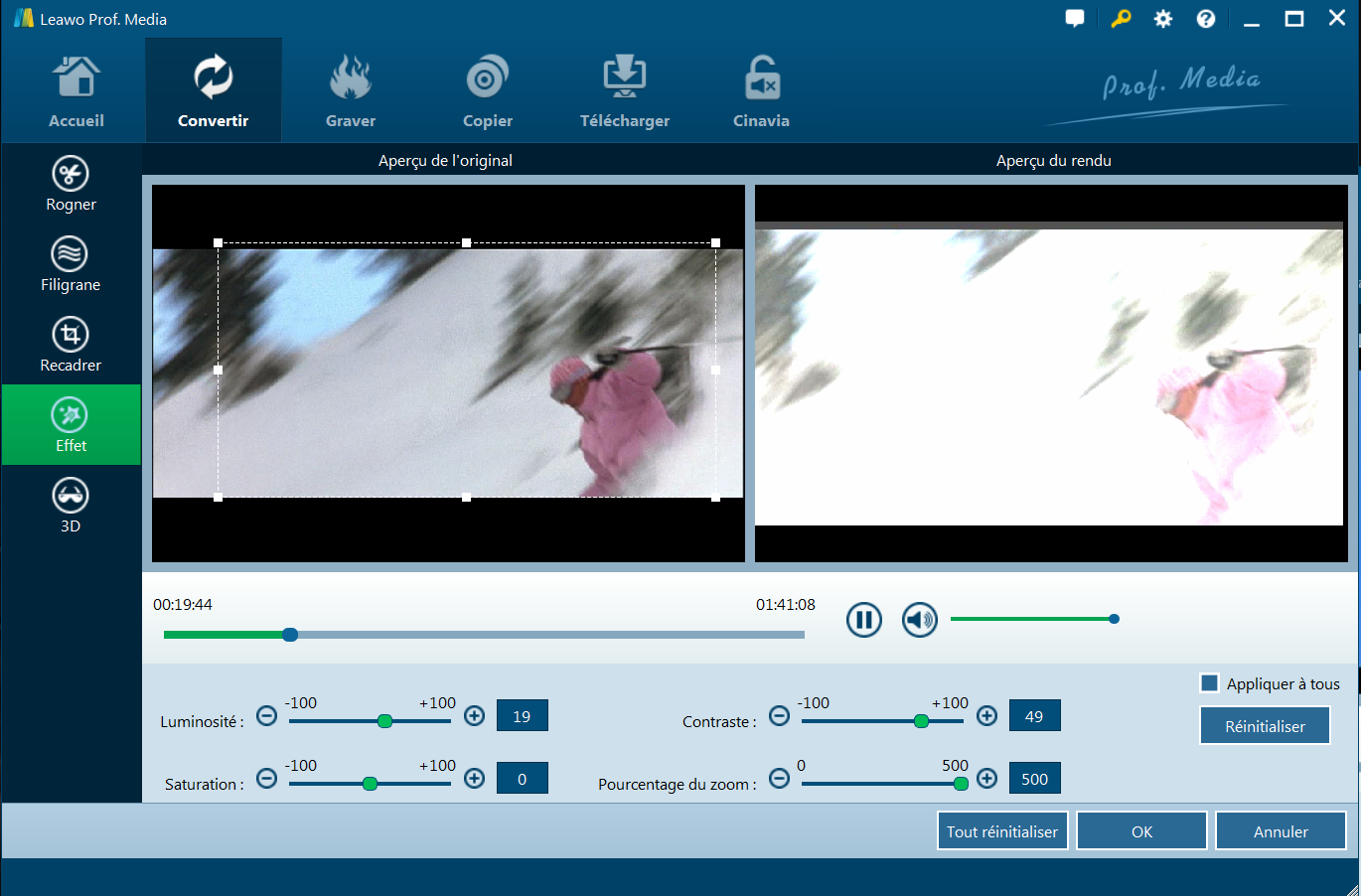 Sous la section ‘Effet’, faites glisser le curseur de ‘Luminosité’ ‘Contraste’ ‘Saturation’ et le Pourcentage du zoom’ pour appliquer un effet particulier. Cochez ‘Appliquer à tous’ pour employer un effet dans les fichiers téléchargés. Appuyez sur ‘OK’ pour le confirmer.