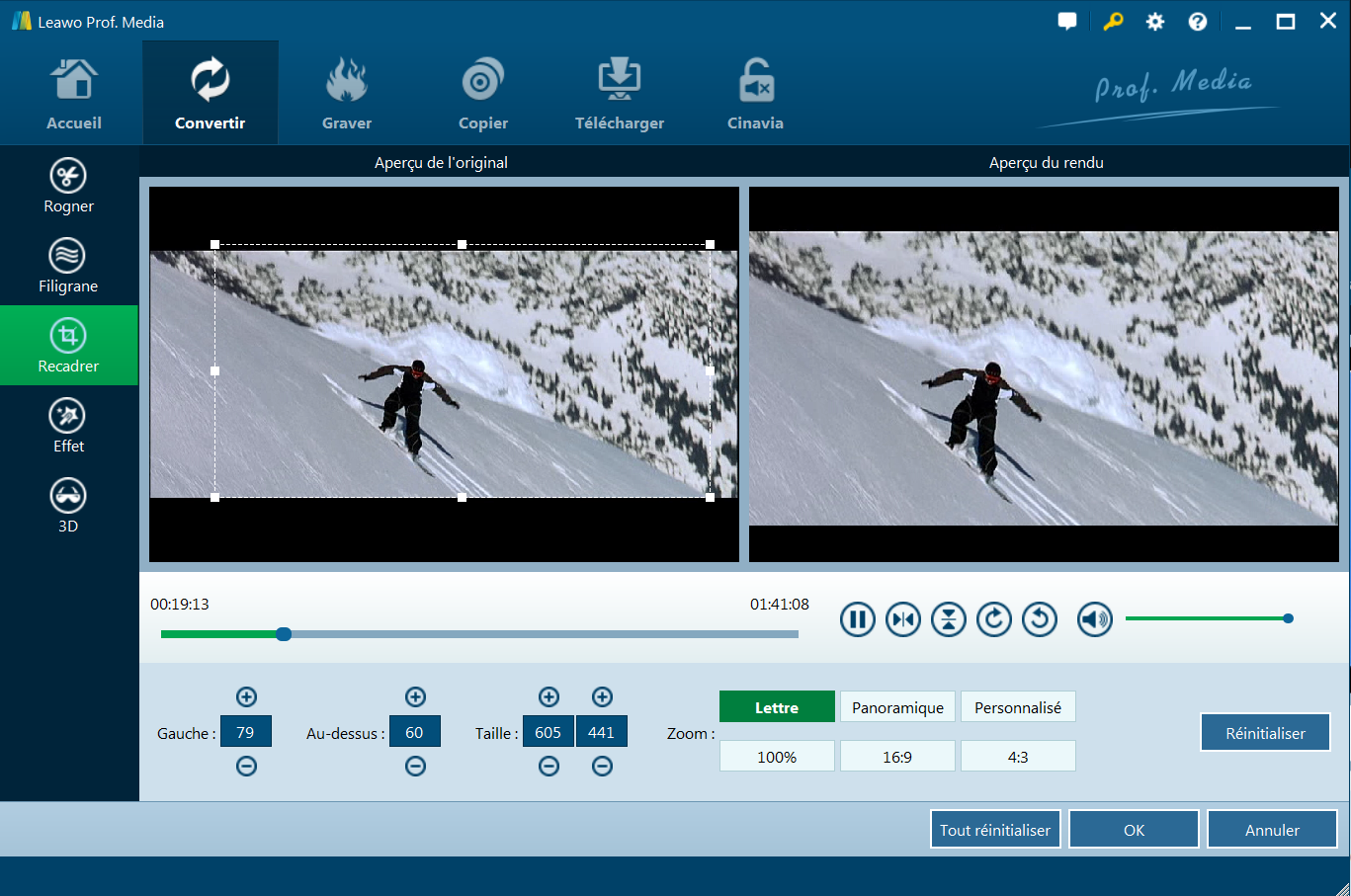 Sous le bouton ‘Recadrer’, vous pouvez glisser le cadre pour recadrer la vidéo ou sélectionnez ‘Lettre/Panoramique/Personnalisé/Pleinécran/16:9/4:3 dans le ‘Zoom’, et régler la valeur ‘Gauche’ ’Au-dessus’ ’Taille’ pour ajuster la taille vidéo. Appuyez sur ‘OK pour le confirmer.