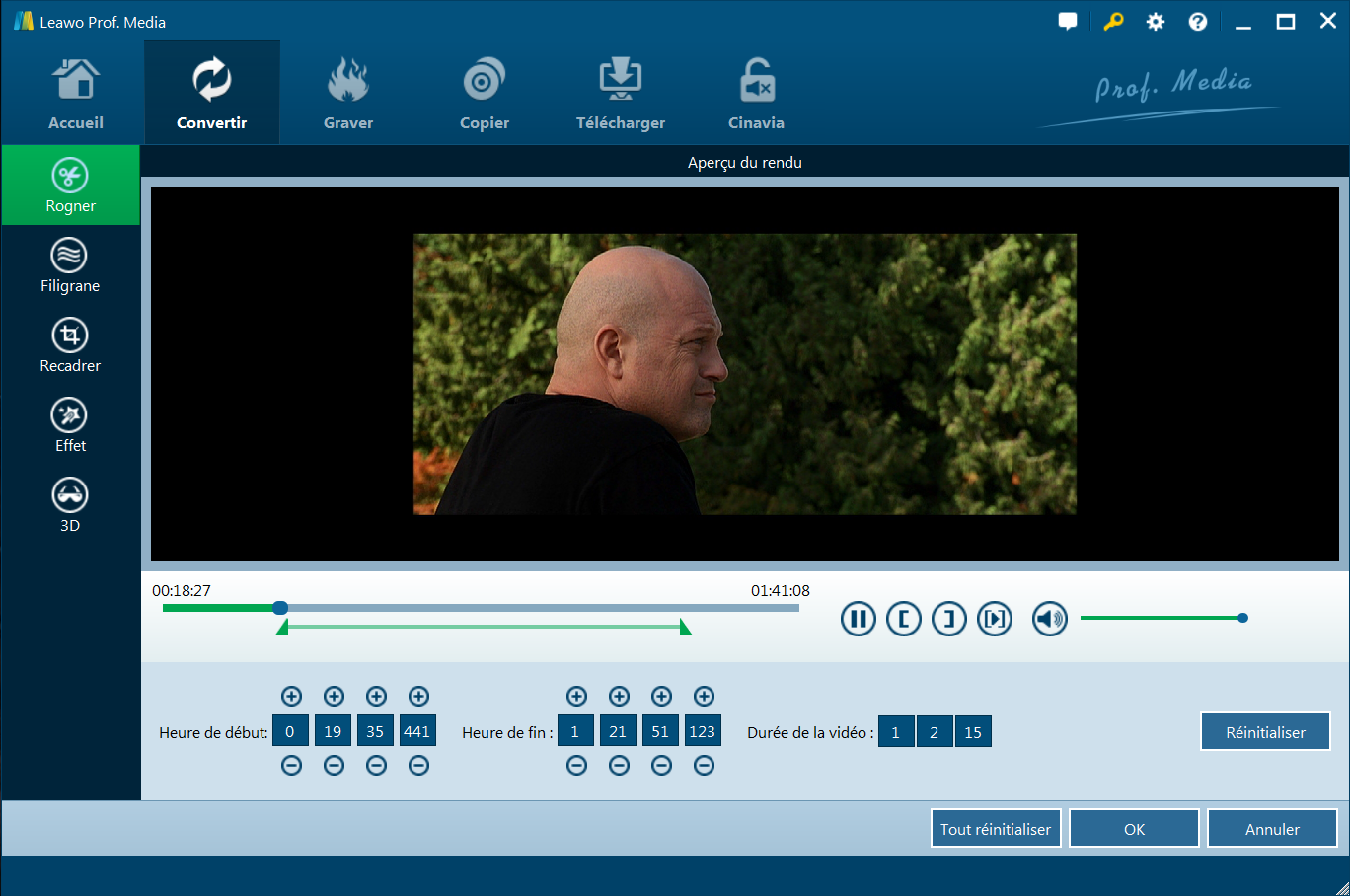 Sous la section ‘Rogner’, vous pouvez glisser directement le curseur pour rogner la longueur de vidéo, ou éditer la valeur d’entrée manuellement dans la boîte ‘Heure de début’ ainsi que ‘Heure de fin’. La longueur de clip vous sera présentée immédiatement. Vous pouvez la confirmer en redéfinissant ou cliquant sur ‘OK’.