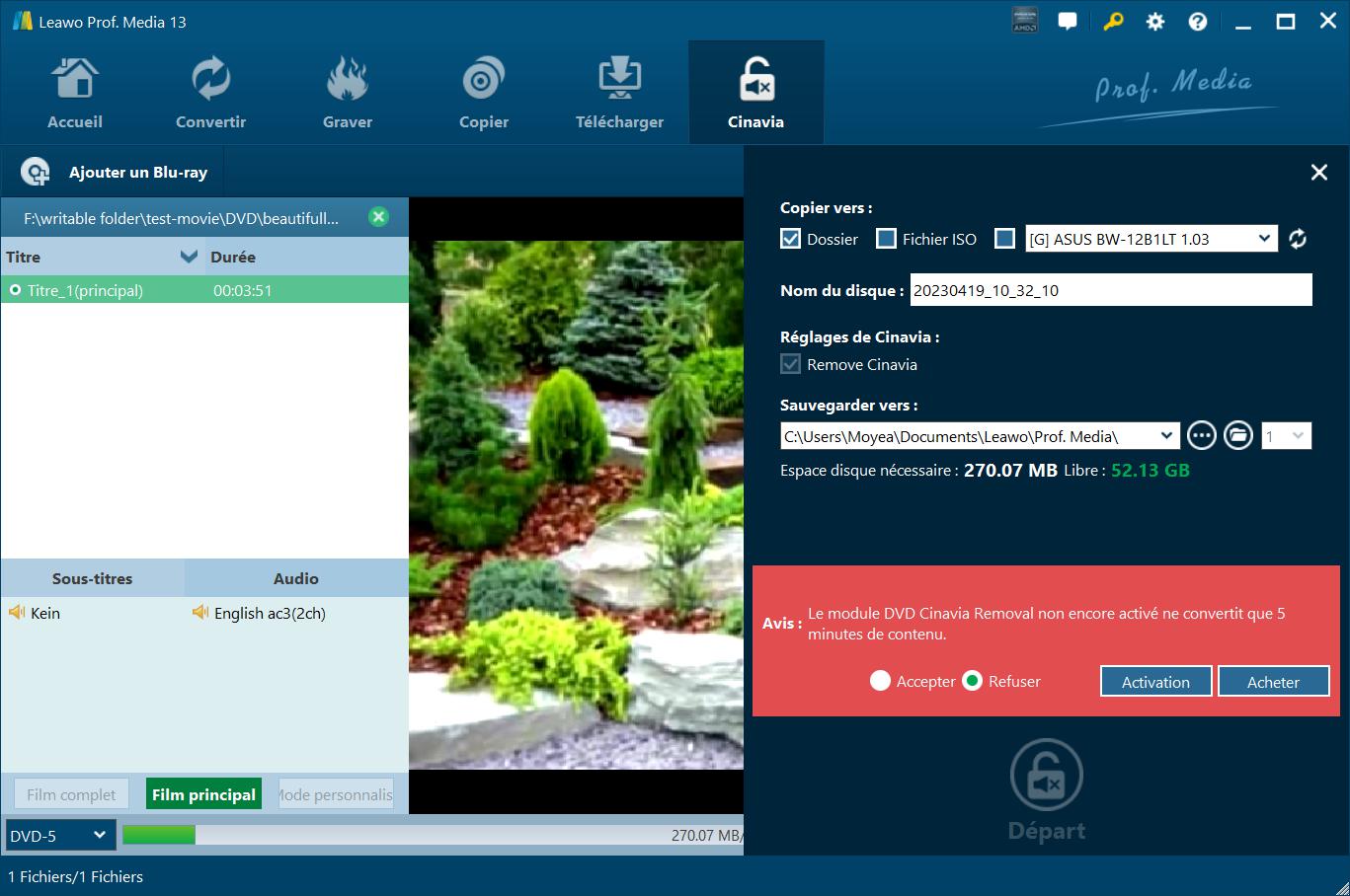 Remarque : Si vous n'avez pas activé le module DVD Cinavia Removal de Leawo, un message vous indiquera les limitations de la version d'essai gratuite. Vous pouvez accepter les limitations, ou essayer d'acheter une licence et d'activer le module DVD Cinavia Removal de Leawo.