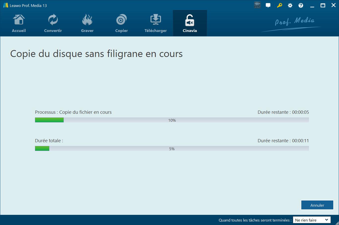 Enfin, cliquez sur le bouton « Démarrer » en bas de la barre latérale pour commencer à copier le contenu des DVD avec filigrane Cinavia dans DVD Cinavia Removal de Leawo. Sur l'interface « Copier un disque sans filigrane », vous pouvez visualiser l'intégralité du processus de copie de DVD et définir l'opération ultérieure dans le coin en bas à droite.